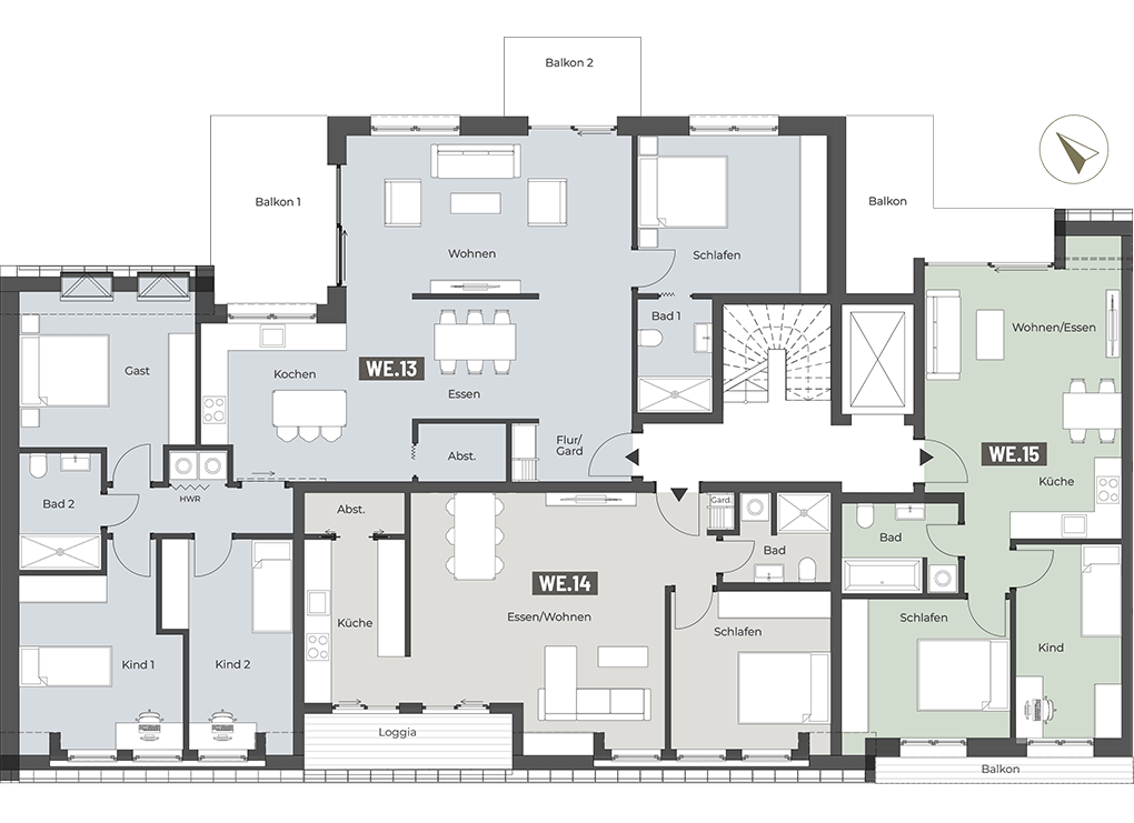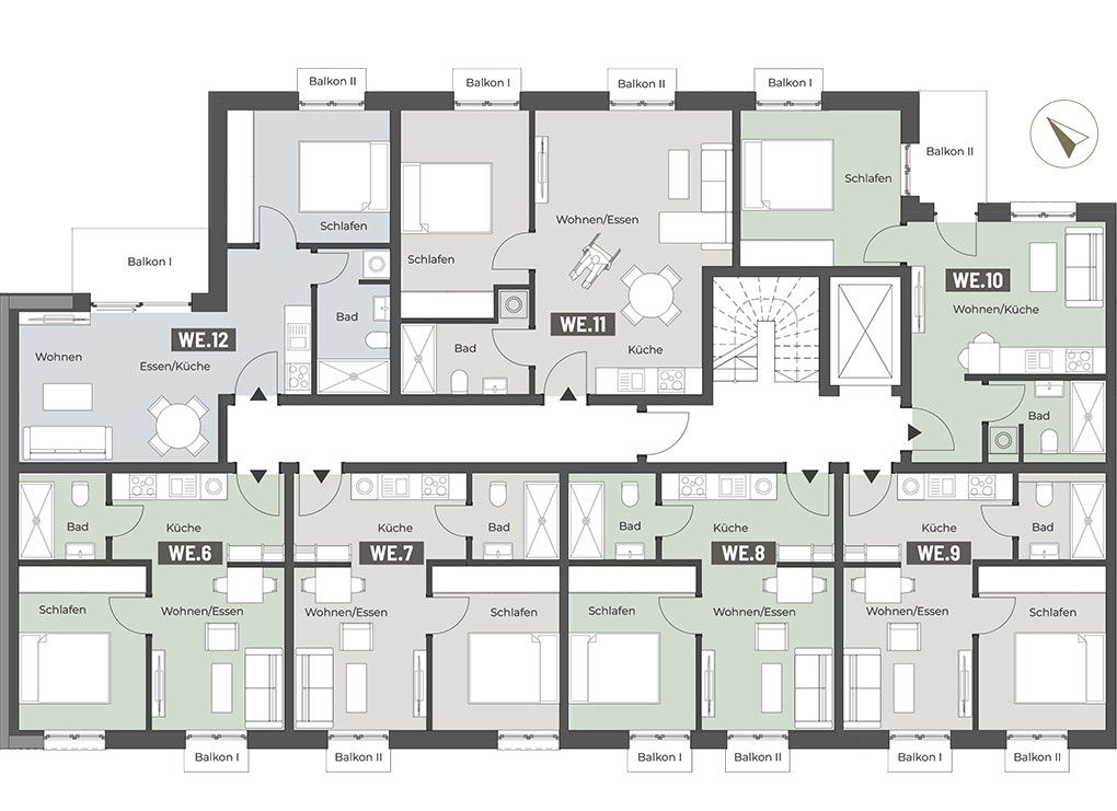 Die 2- bis 5-Zimmer-Wohnungen mit Wohnflächen von ca. 33 bis 155 m² überzeugen mit durchdachten Grundrissen und bieten Raum für unterschiedlichste Lebensentwürfe – ob für Singles, Paare oder Familien. Das 4-Zimmer-Townhouse im Innenhof mit ca. 126 m² Wohnfläche eignet sich besonders für Familien, die urbanen Komfort und Privatsphäre schätzen.