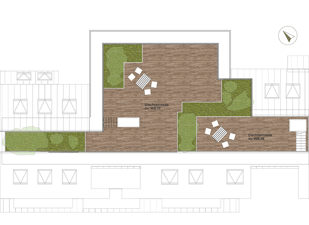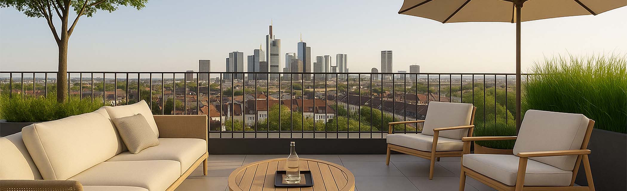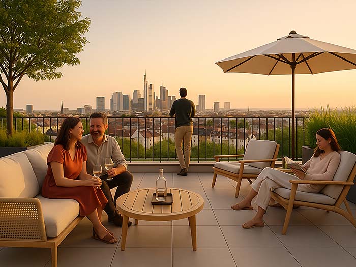 Das elegante Townhouse verfügt über zwei separate Dachterrassen für entspannte Stunden im Freien. Ein weiteres Highlight sind die Dachterrassen der exklusiven Penthouse-Wohnungen, die einen beeindruckenden Panoramablick auf die Frankfurter Skyline und Innenstadt bieten. Die Erdgeschosswohnung punktet zudem mit einem privaten Gartenbereich im Innenhof.